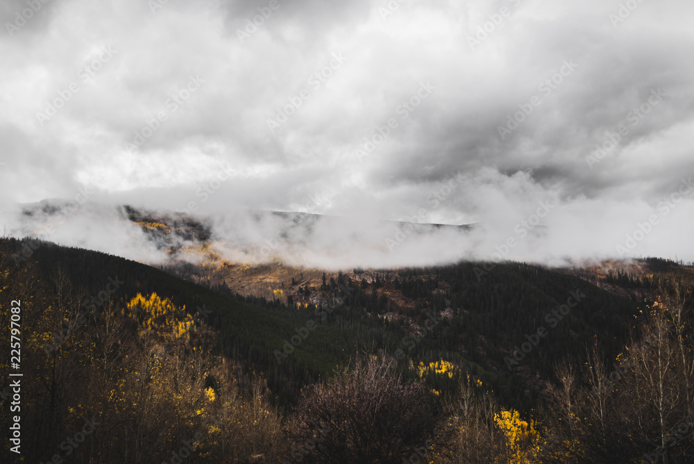 Mountains covered in low hanging clouds during autumn in Colorado.
