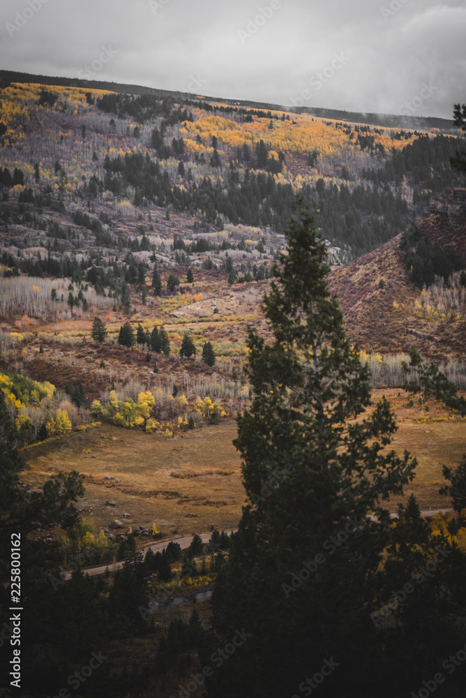 Landscape views of fall foliage in the rocky mountains in Colorado.