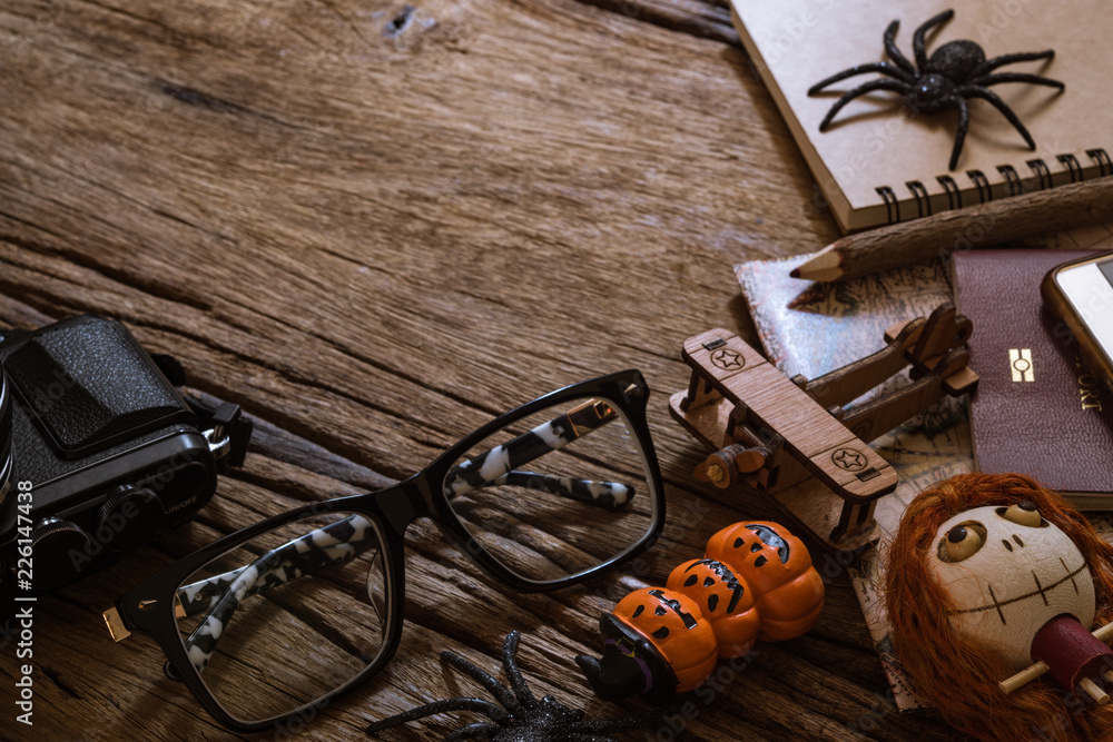 Planning Halloween destination travelling concept. Top view with copy space of Happy Halloween toys with accessory items to travel on wood background.