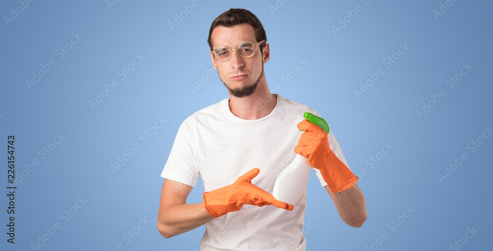 Housekeeper with cleaning product and equipment in front of a blue empty wall