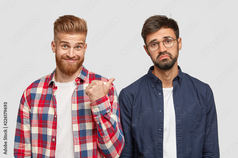 Look at this guy! Ginger bearded young man points with thumb at his fellow who has hesitant expression, suggets to ask him question, dressed in casual clothes, isolated over white background