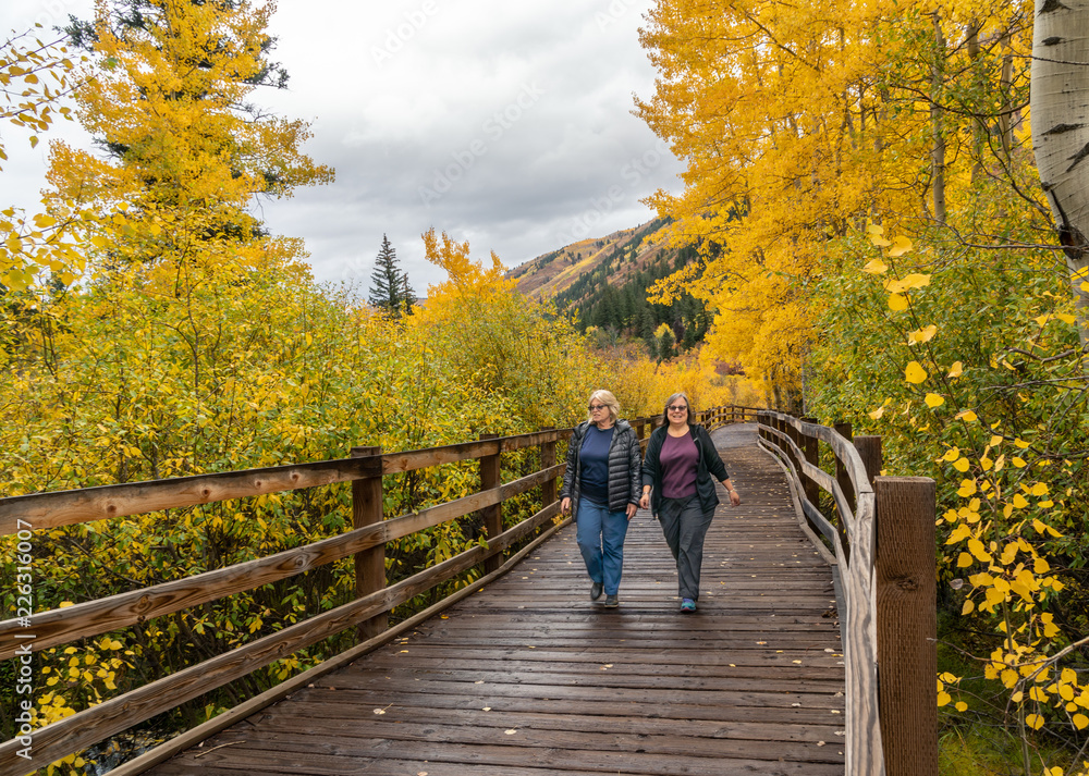 Women hiking along the East of Aspen Trail which Parallels the Roaring River with trees at full fall colors, Aspen Colorado