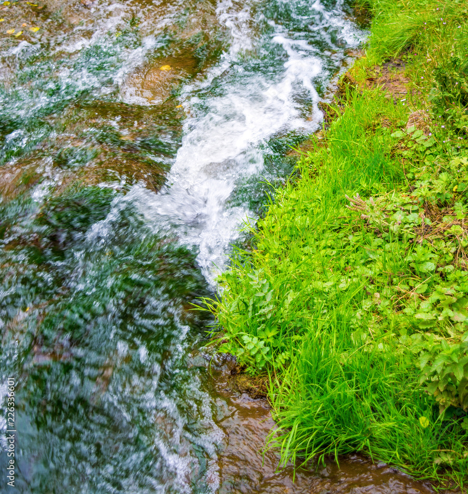Photo of mountain river flowing through the green forest