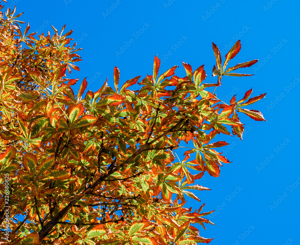 orange-green leaves on a chestnut branch against a blue sky. Autumn approach concept