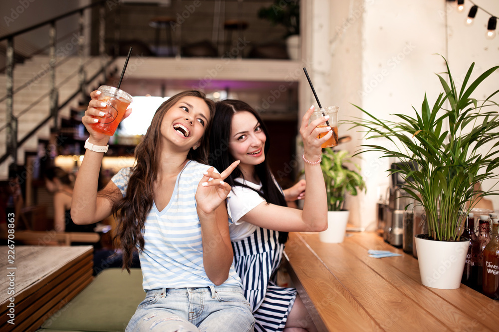 Two pretty youthful smiling girls,dressed in casual outfit,sit next to each other and look at the camera in a cozy coffee shop.