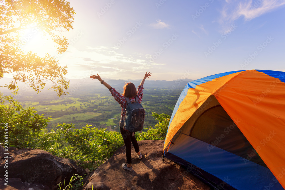 Freedom traveller show hands freedom enjoying with nature sunset in tent camping on holiday