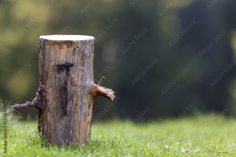 Close-up shot, isolated tree stump outdoors on grassy sunny summer forest clearing on dark green wood foliage blurred background. Environment protection and ecological problems concept.