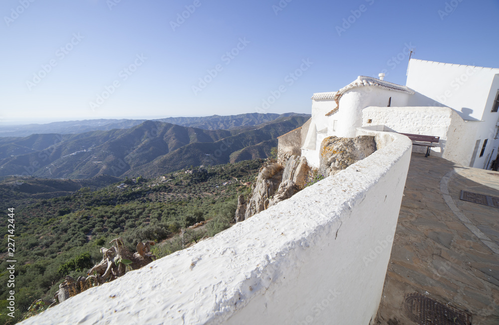 Comares, white village up on the hill of Malaga mountains, Andalusia, Spain. Townhouses
