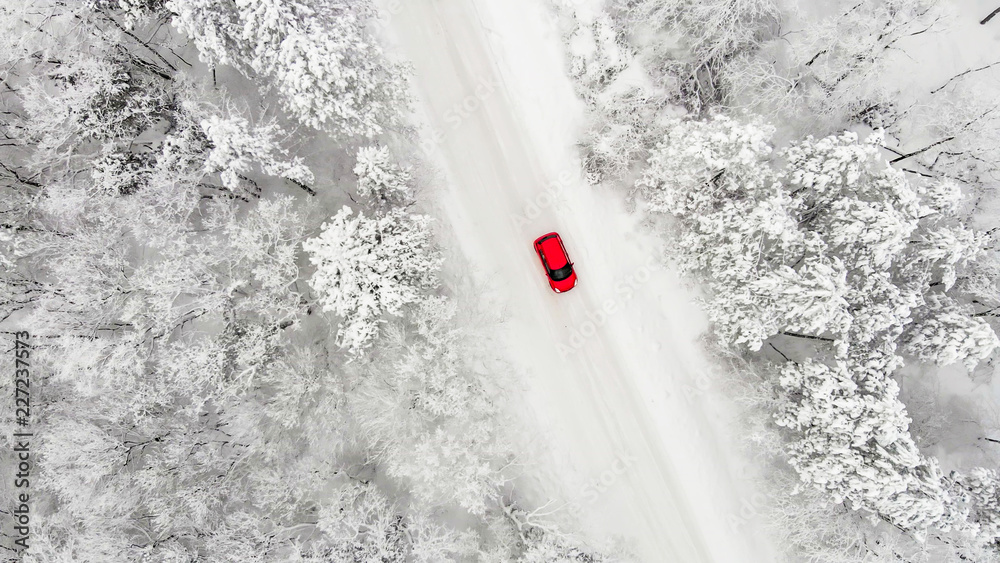 rotes Auto auf einer schneebedeckten eisigen Straße im Winter von oben, Luftbildaufnahme