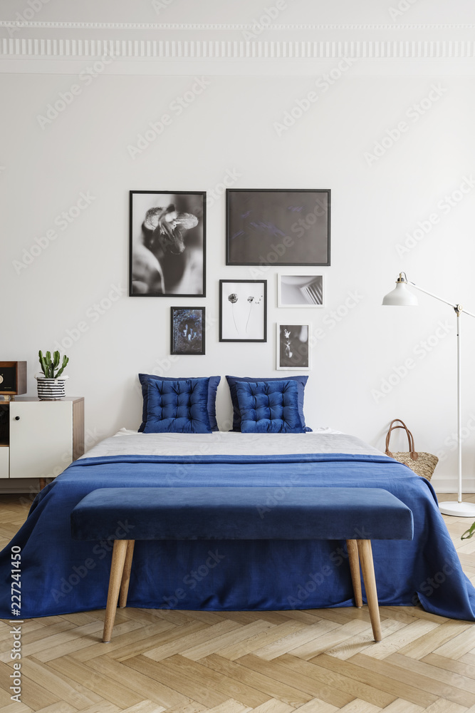 Photo gallery on a white wall above a navy blue bed with elegant cushions in a stylish bedroom interior with herringbone parquet floor
