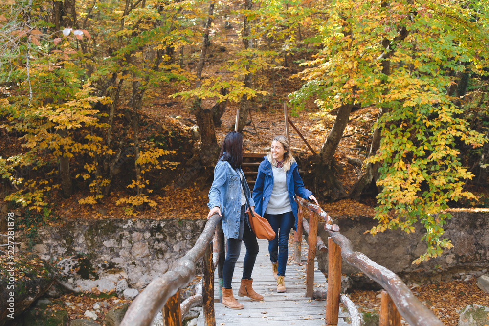 Two young girl friends walking on a wooden bridge in the autumn forest, talking and laughing.