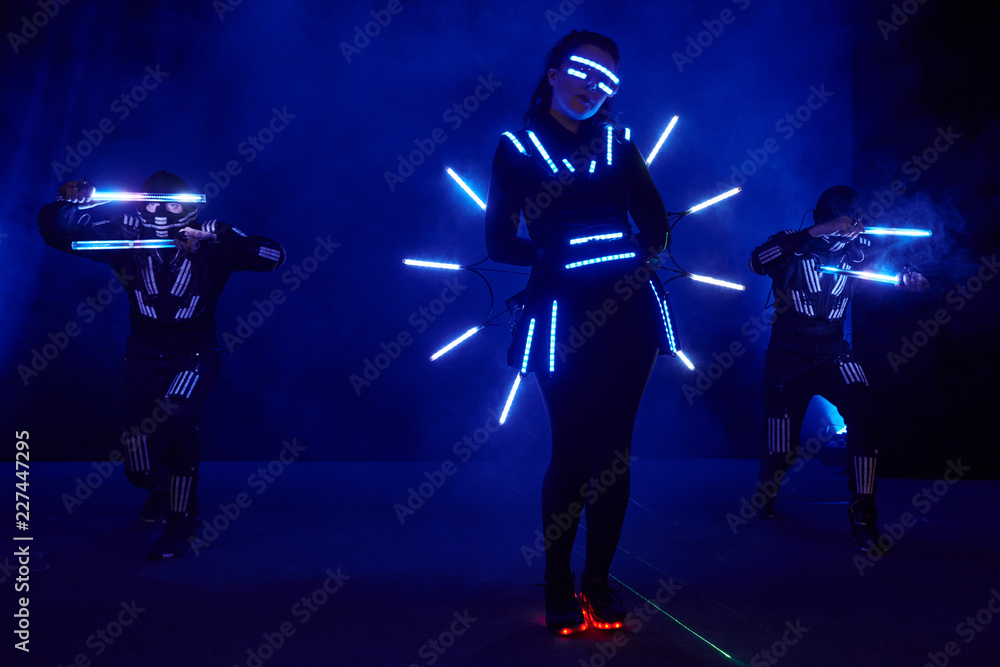 Laser show performance, dancers in led suits with LED lamp, very beautiful night club performance, party