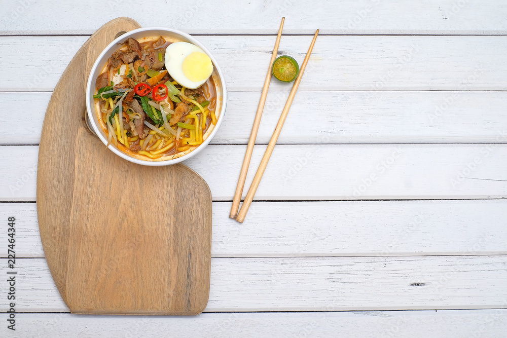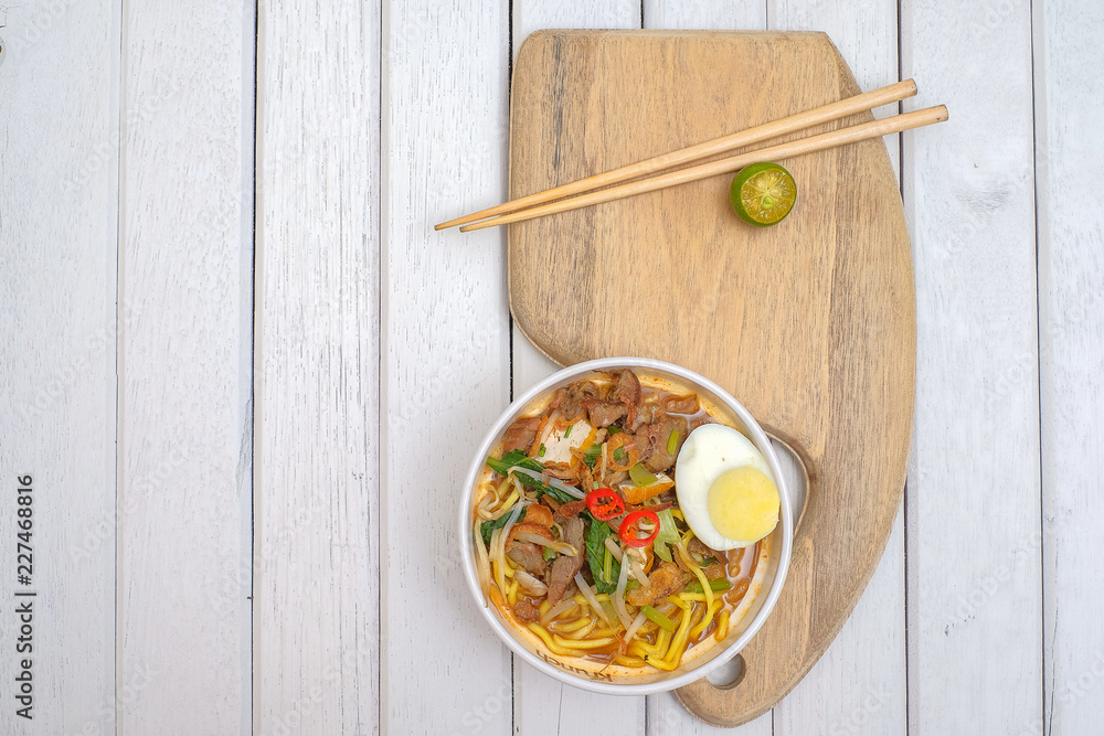 Mee Rebus in the bowl with chopsticks on white table This dish is made of noodles ,vegetable,egg with a spicy .