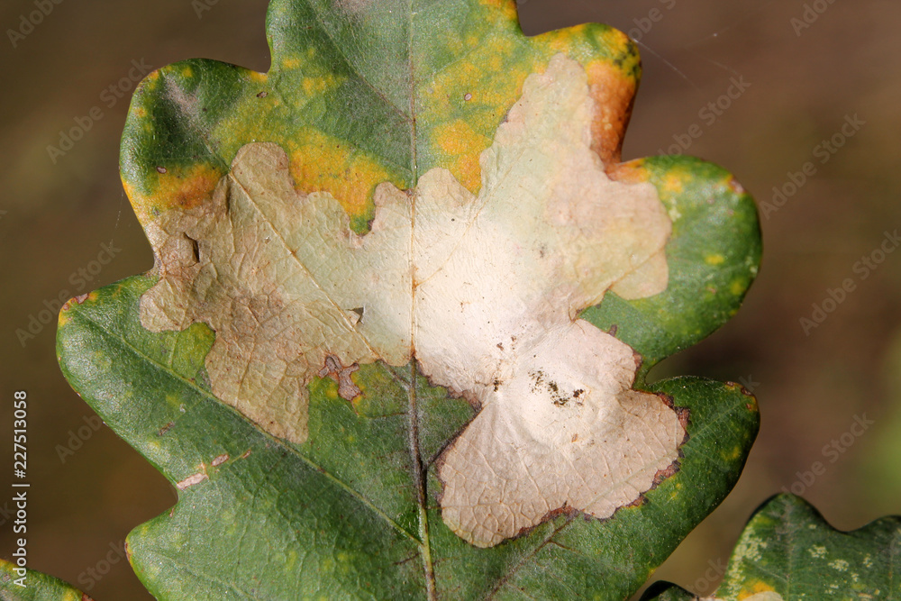 Leaf mine of Tischerid moth or Tischeria ekebladella on leaf of European oak or Quercus robur