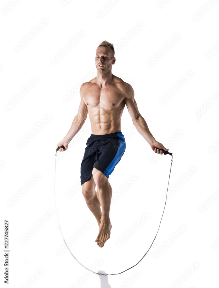 Shirtless muscular young blond man jumping or skipping rope in studio shot, isolated on white