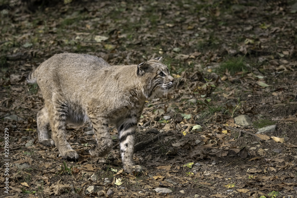 Bobcat walking through a clearing with Fall leaves on the ground