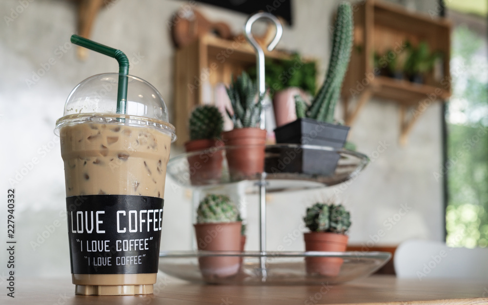 Ice coffee with I love coffee label in a lovely coffee shop green plant decoration.