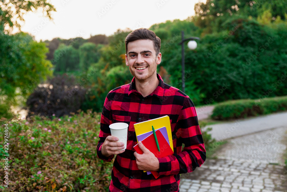 Happy student drinking hot coffee and resting after studying. Handsome and stylish brunet male wearing in red checked shirt walking in autumn park with notes and showing at camera cup of coffee.