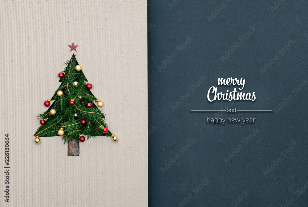Merry Christmas and happy new year greetings in vertical top view dark blackboard with natural eco decorated christmas tree pine in cardboard.Xmas winter holiday season social media card background