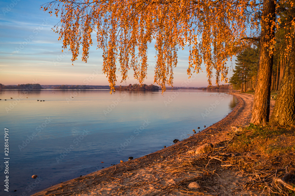Gold autmn sunset at Minsk sea beach (Zaslavl Reservoir), Minsk, Belarus.