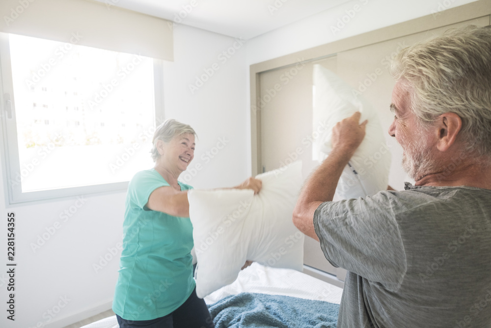 Happy caucasian aged senior adult couple enjoy the early morning making a pillows war together playing and laughing a lot. love and married forever life concept with joyful and playful mature people