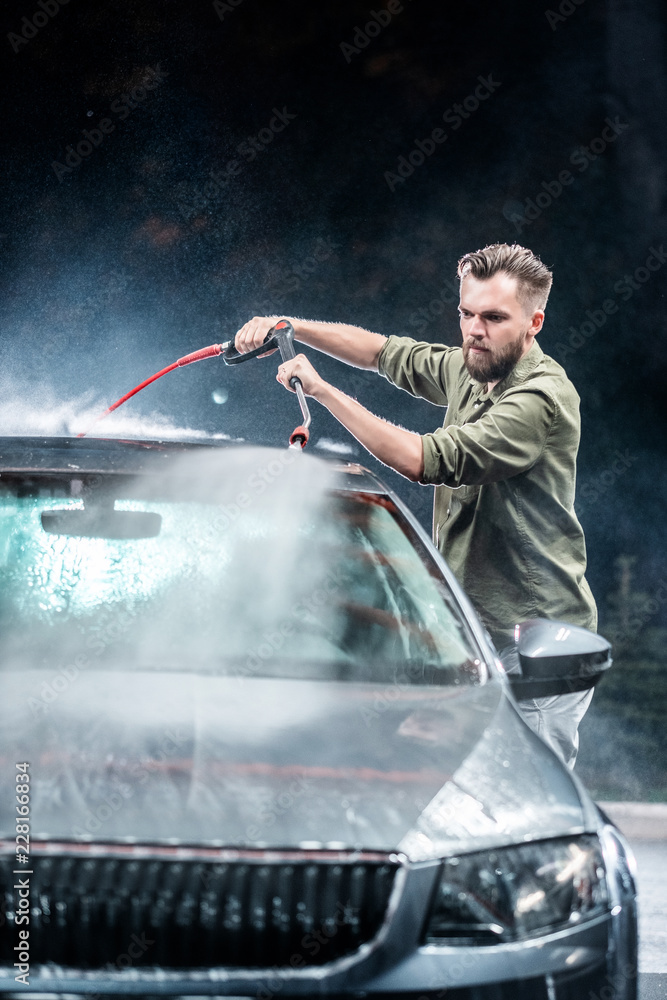 A man with a beard or car washer washes a gray car with a high-pressure washer at night in on the street