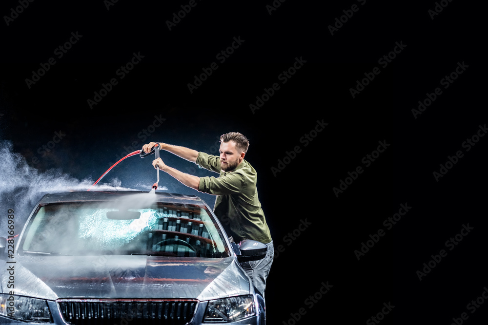 A man with a beard or car washer washes a gray car with a high-pressure washer at night in on the street