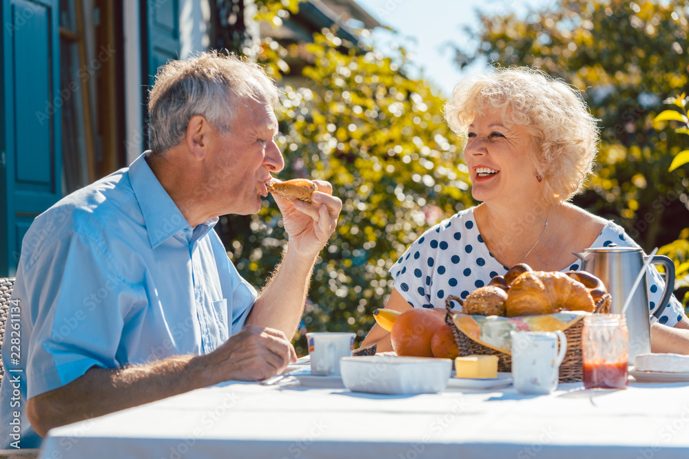 Senior woman and man having breakfast sitting in their garden outdoors in summer, eating bread rolls and drinking coffee