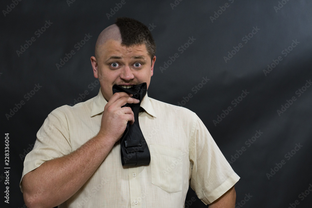 Punk. Dark tie partially bitten in the mouth. On the face of indignation and resentment. Nervous breakdown.