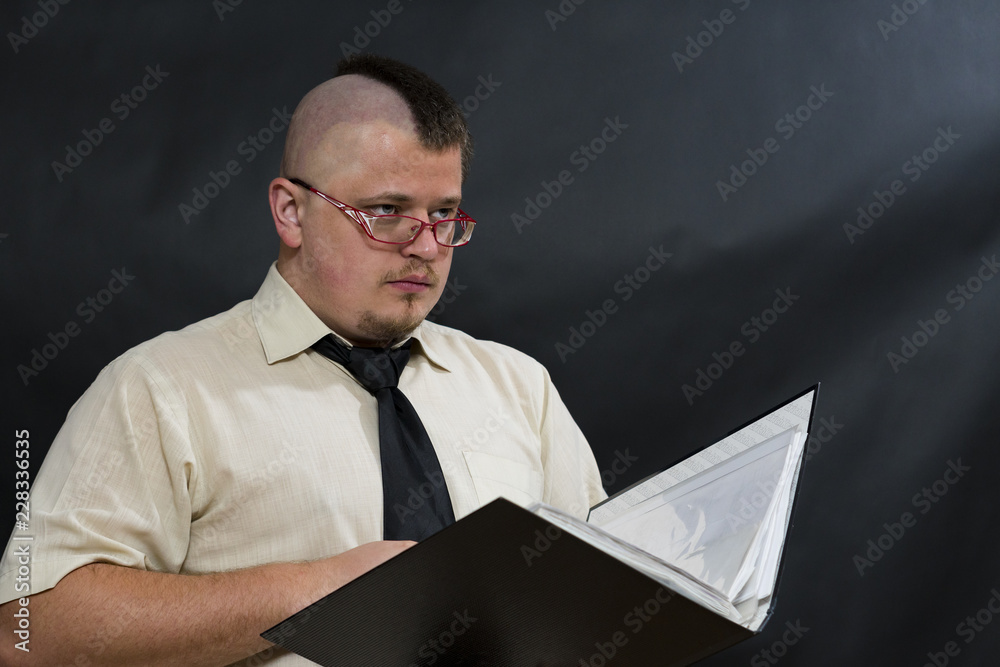 Punk stands with a working folder. White shirt and red tie. The person is turned towards the interlocutor and expresses a question.