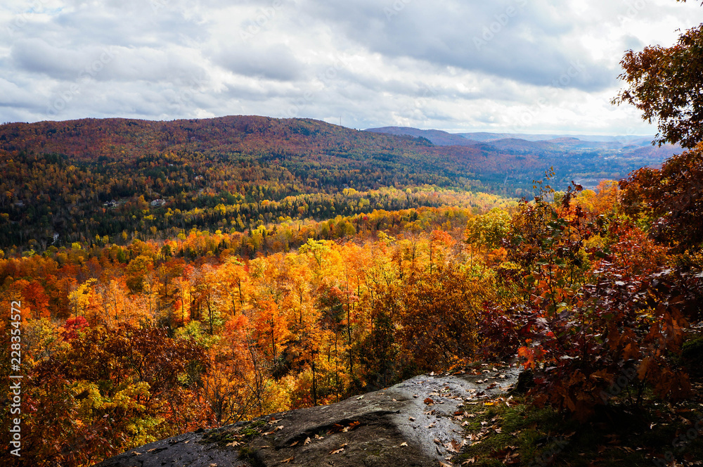 Wonderful sunlight over the colorful valley of maple trees after the rain, Quebec, Canada