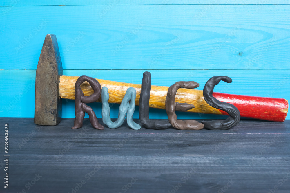 Breaking the rules concept, plasticine letters and a hammer on the blue background.
