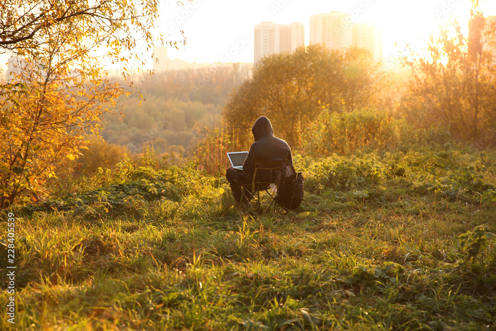 Man works at a laptop in the Park, in the rays of the setting sun.