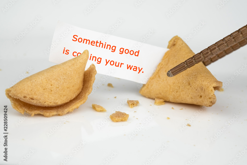 CRACKED FORTUNE COOKIE WITH WORD "SOMETHING GOOD IS COMING YOUR WAY" ON WHITE SLIP PAPER
