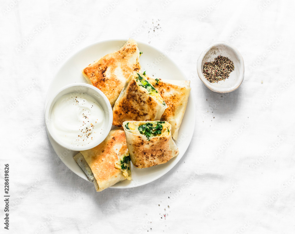 Fried stuffed chickpeas, spinach, leek and mozzarella rolls on a light background, top view. Delicious snack, appetizers, tapas or breakfast