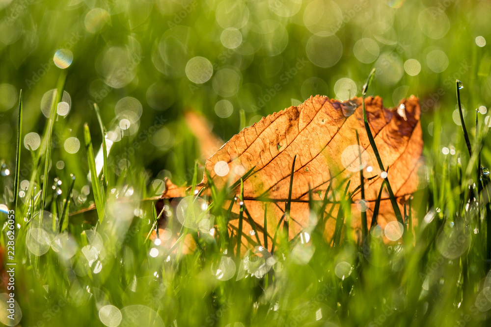 single orange fall leaf on the green grass ground back lit by the sun with morning dew around