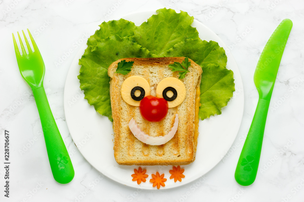 Funny clown face grilled sandwich with cheese and vegetables for kids lunch top view