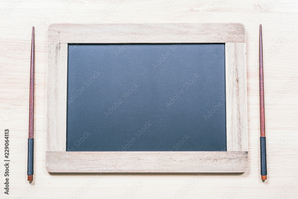 Blackboard With Wooden Frame And Copy Space For A Menu Next To Two Chopsticks