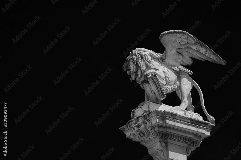 Saint Mark Lion statue, symbol of ancient Republic of Venice, made in 1870 at the of a column in 'Piazza dei Signori' (Lord's Square) in the center of Padua (Black and White with copy space)