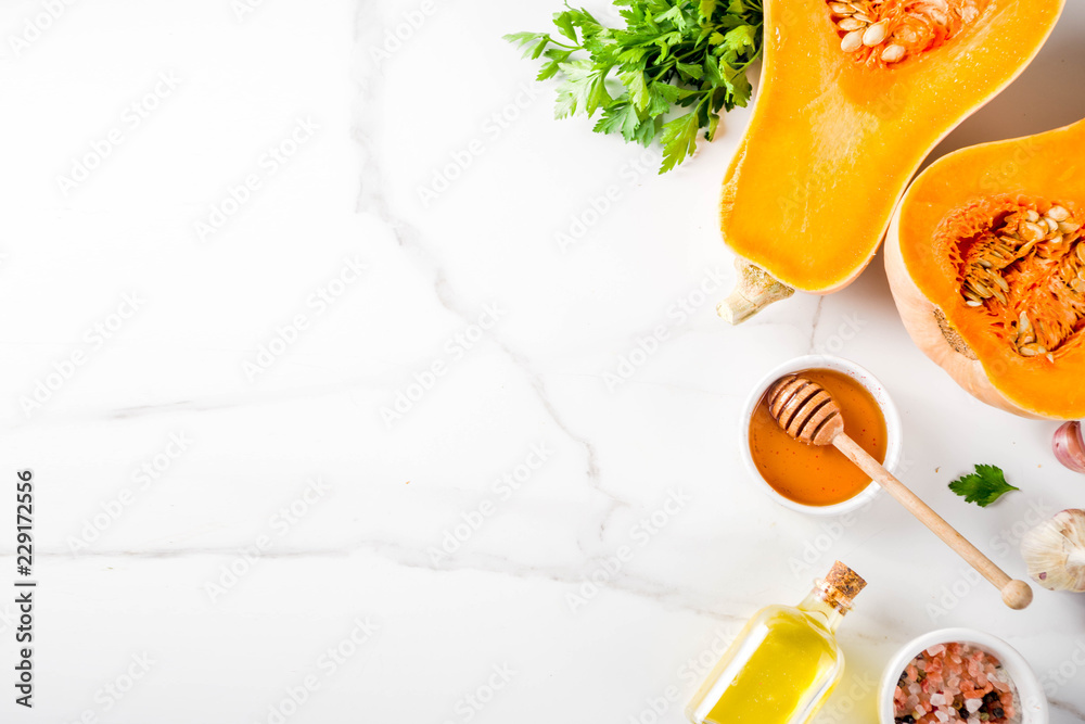Halves of raw pumpkin or butternut squash, with olive oil, spices and ingredients for cooking