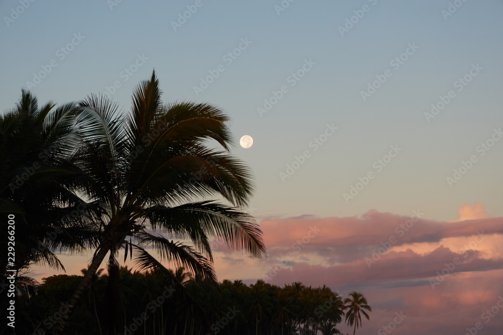 Palm trees at sunset with beautiful clouds and view of the moon.