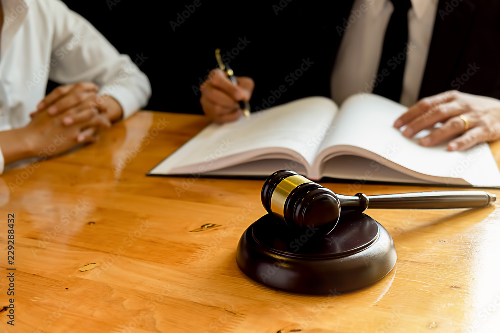 Judge gavel with Justice lawyers having team meeting at law firm background. Concepts of Law and Legal services.
