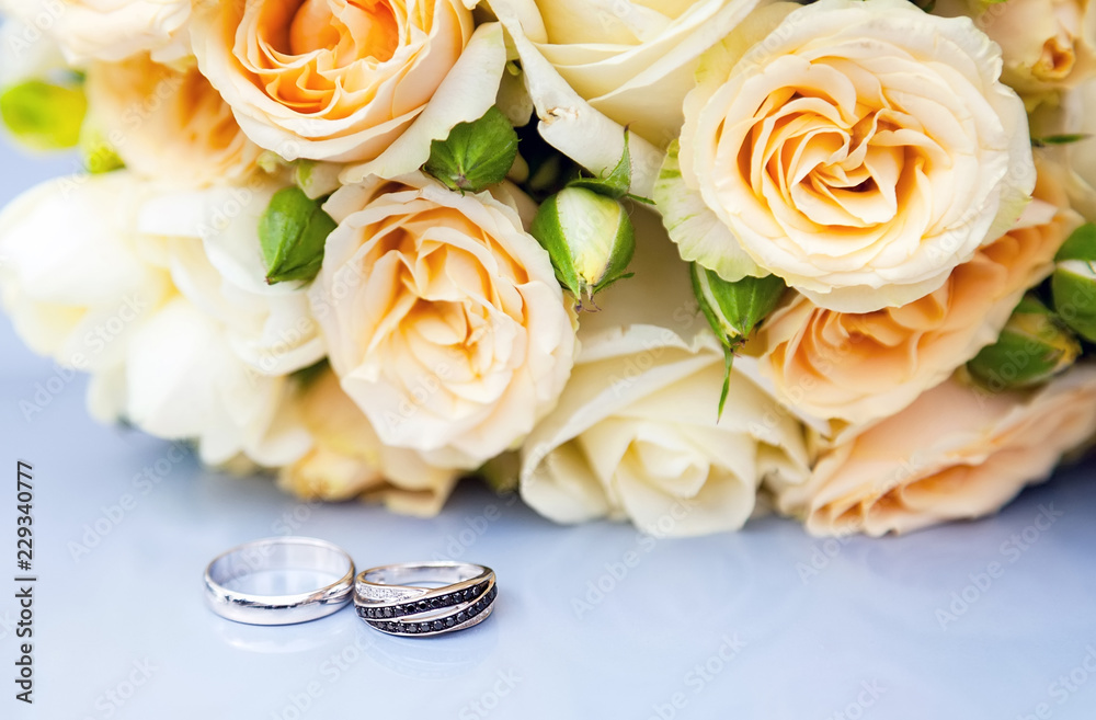 white gold wedding rings with black gems and bridal bouquet of cream roses