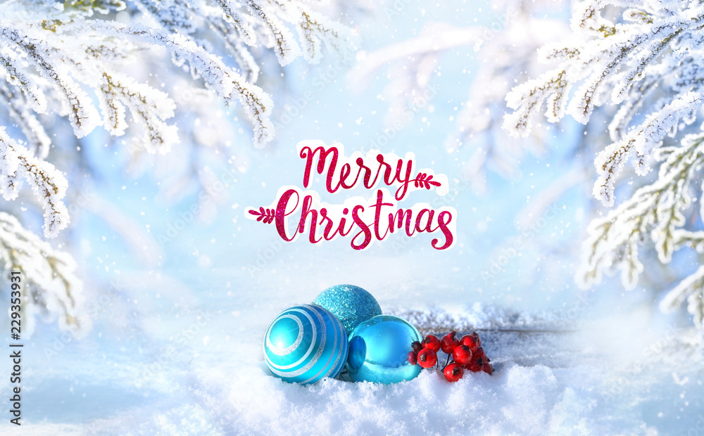 Winter Christmas scenic colorful greeting card, inscription Merry Christmas. Snow landscape with spruce branches, snowdrifts, blue christmas balls on sunny frosty day on nature outdoors.