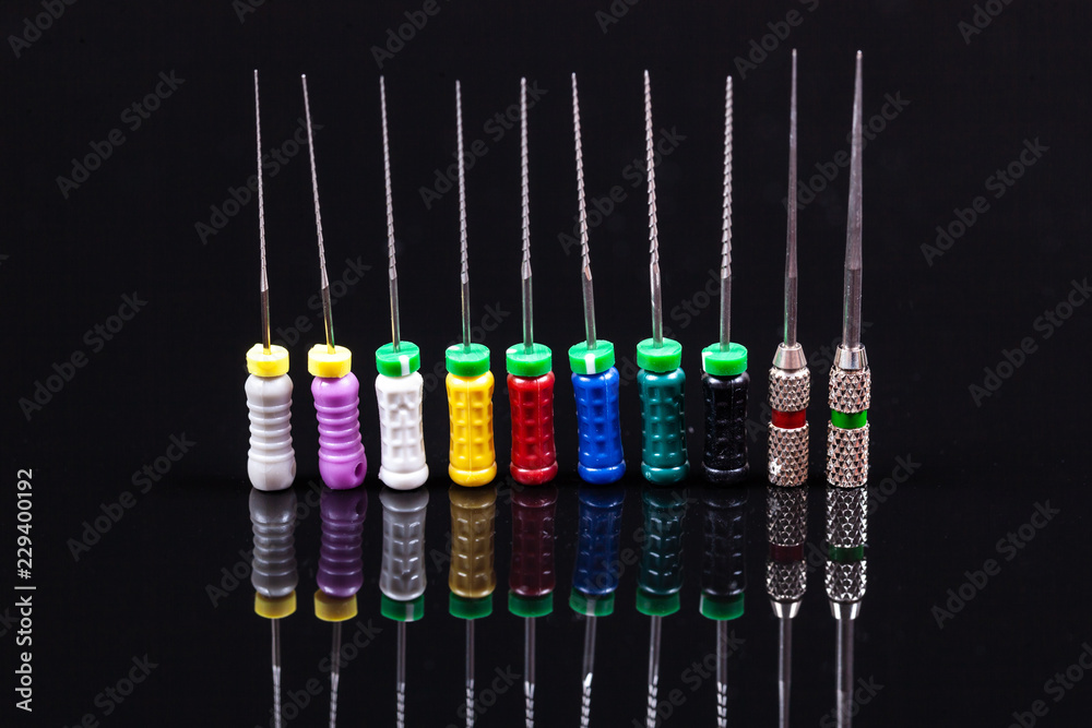 dental and endodontic restoration instruments on a black dark background. Top view