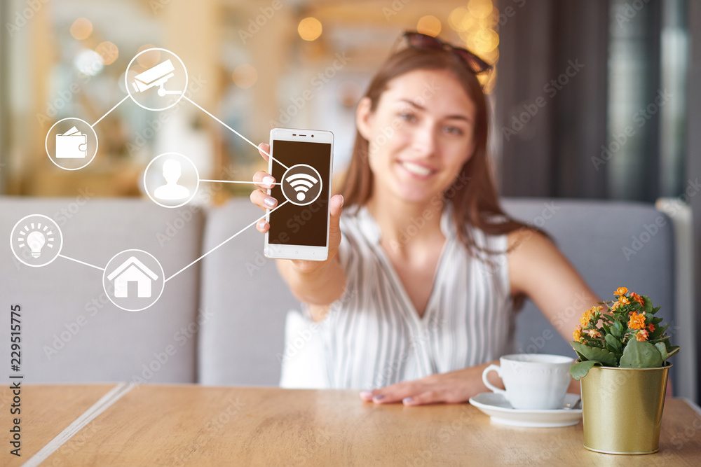 Woman using modern mobile smart phone connecting to wifi automation apps. Remote virtual control at home.
