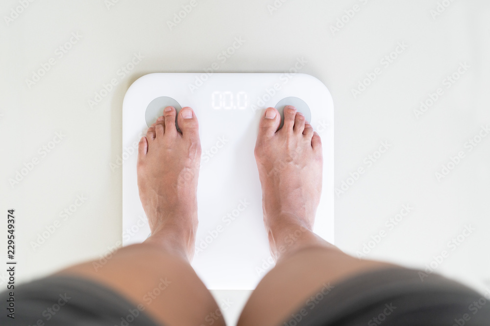 young woman standing on digital weight scale