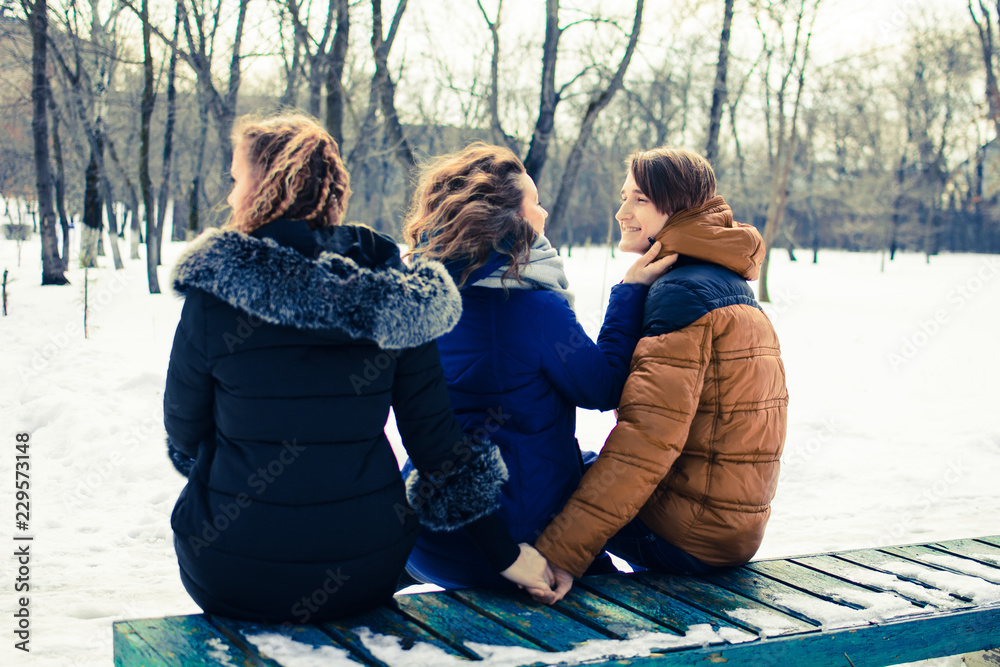 The concept of the image of marital infidelity. Young people on the bench, hugs one and hold the other's hand
