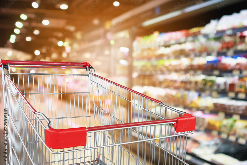 supermarket grocery store with fruit and vegetable shelves interior defocused background with empty red shopping cart