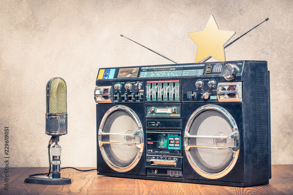 Retro old ghetto blaster stereo radio cassette tape recorder boombox from circa 1980s, large studio microphone and golden star front concrete wall background. Vintage instagram style filtered photo